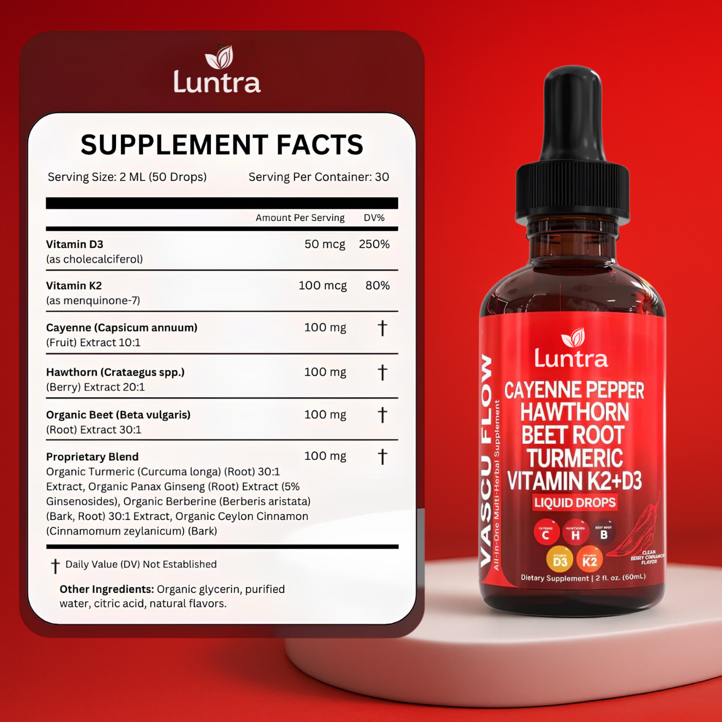 Our Cayenne Pepper Liquid Drops use a potent blend of cayenne pepper, hawthorn extract, and beetroot to improve circulation, cleanse arteries, and reduce plaque buildup. Packed with turmeric, vitamins K2 + D3, and antioxidants, it detoxifies and nourishes your body naturally.